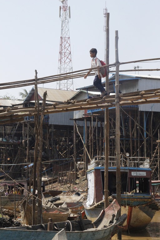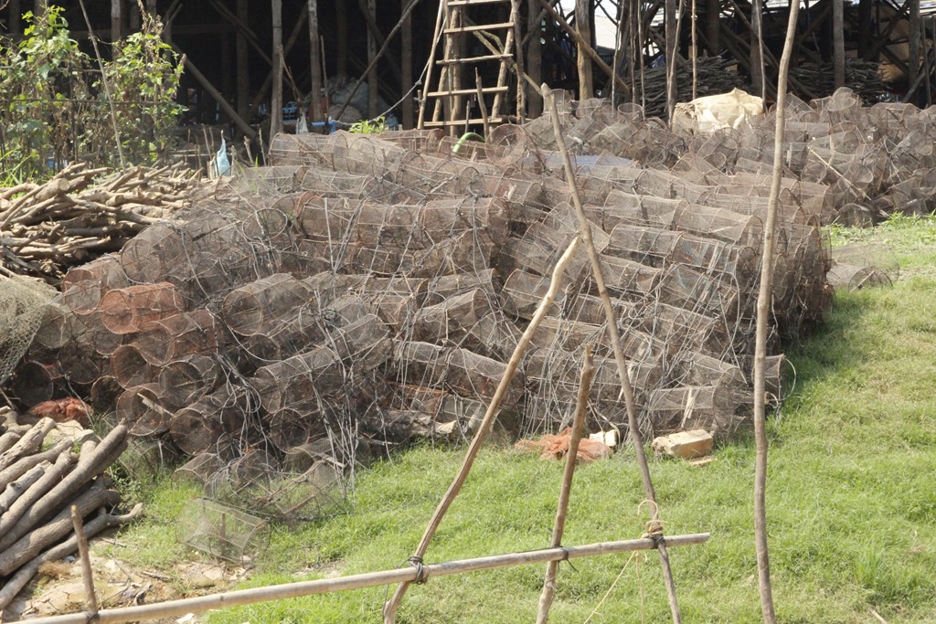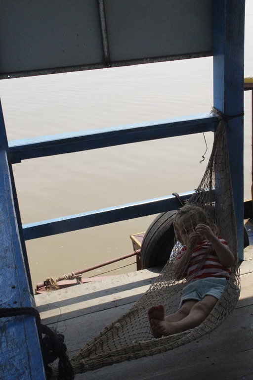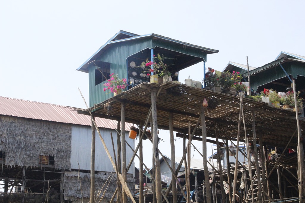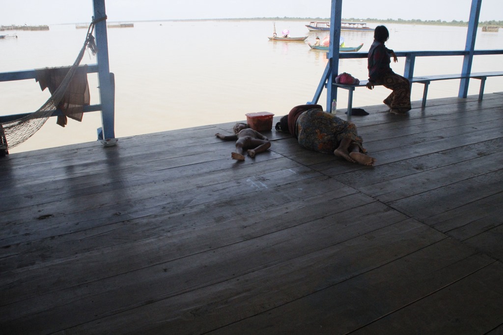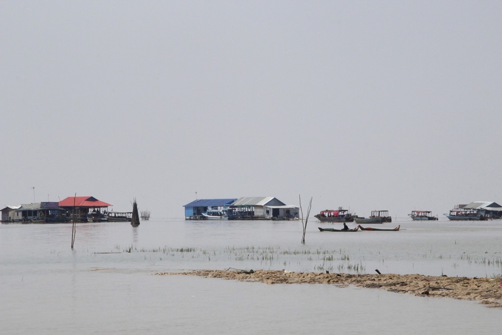 En arrivant sur le lac, on ne fait plus la différence entre le ciel et l’eau. Au fond, les villages flottants qui se déplacent donc en fonction de la crue de la rivière. De la même manière, des paniers de pêches géants se déplacent du lac au Mékong. Là les poissons qui ont grossi pendant leur voyage sont attrapés et vendus.