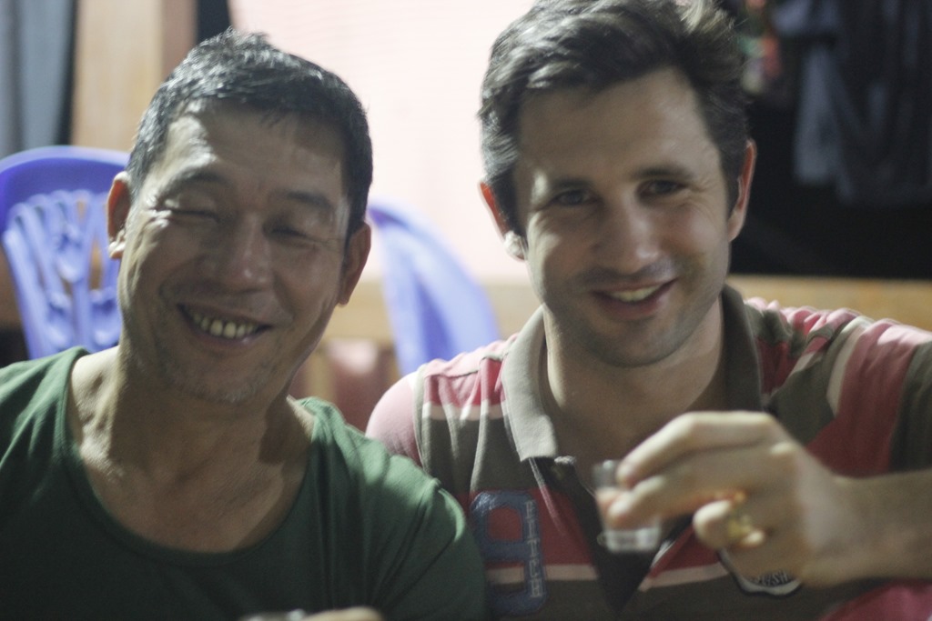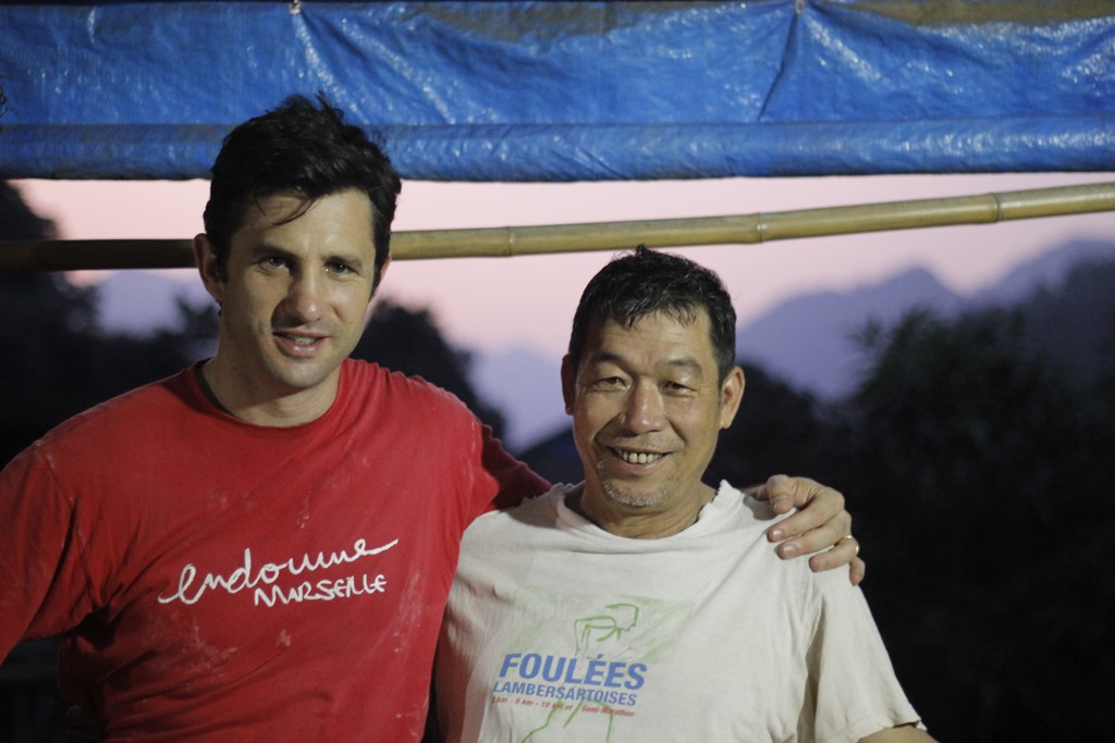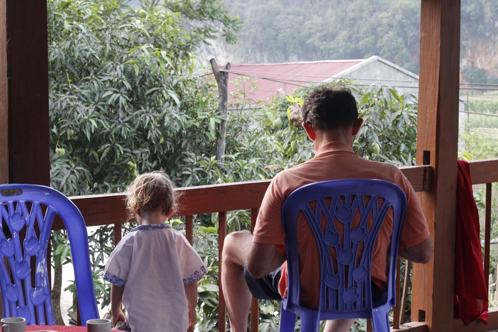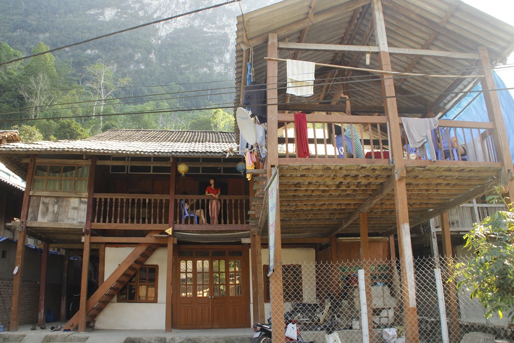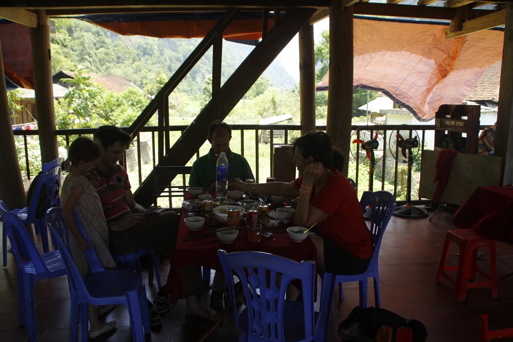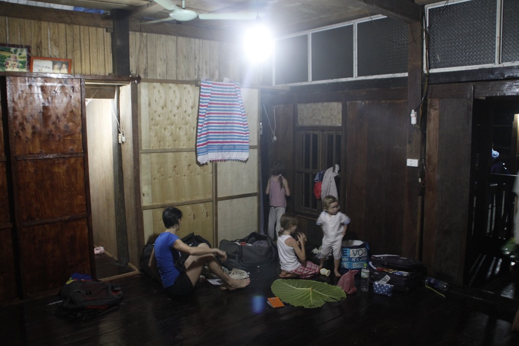 Et nous voilà arrivés dans notre cagna. Une maison sur pilotis (sans buffle en dessous mais des ronfleurs à coté) avec une terrasse, une grande pièce pour l’autel des ancêtres qui a été aménagée à coups de planches de contreplaqués pour en faire 6 chambres (!!!), un couloir, une autre pièces, deux douches aux portes ajourées, une cuisine au feu de bois. Ambiance locale super sympa!