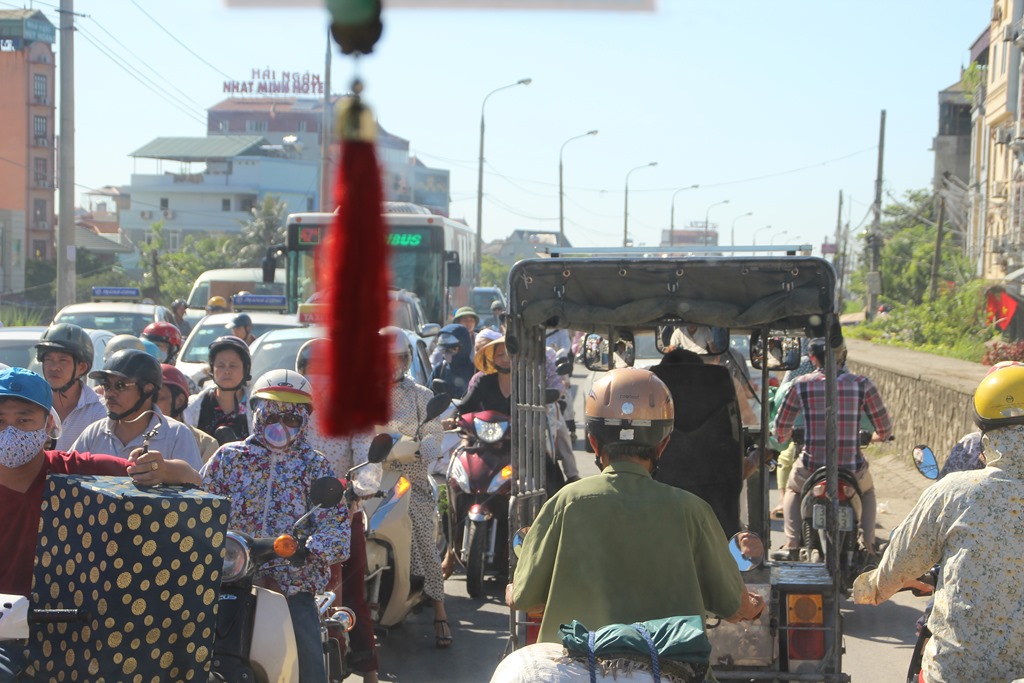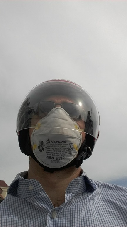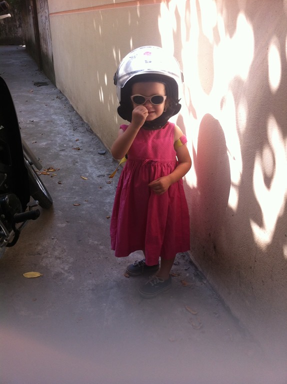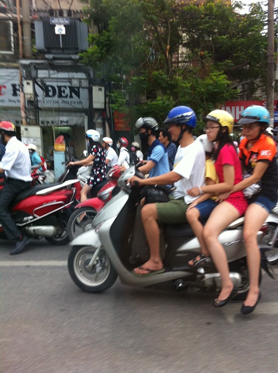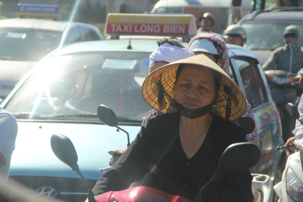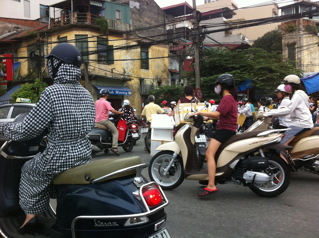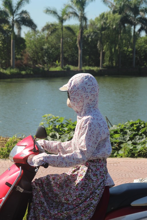 Et la tenue estivale des hanoiennes qui craignent le soleil. Donc toutes les motardes se parent de jolis blousons fleuris et jupes plus ou moins assorties, un masque, un casque… Tout ca sous 45 degrés…