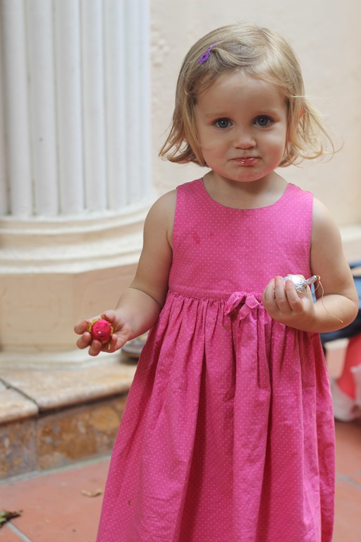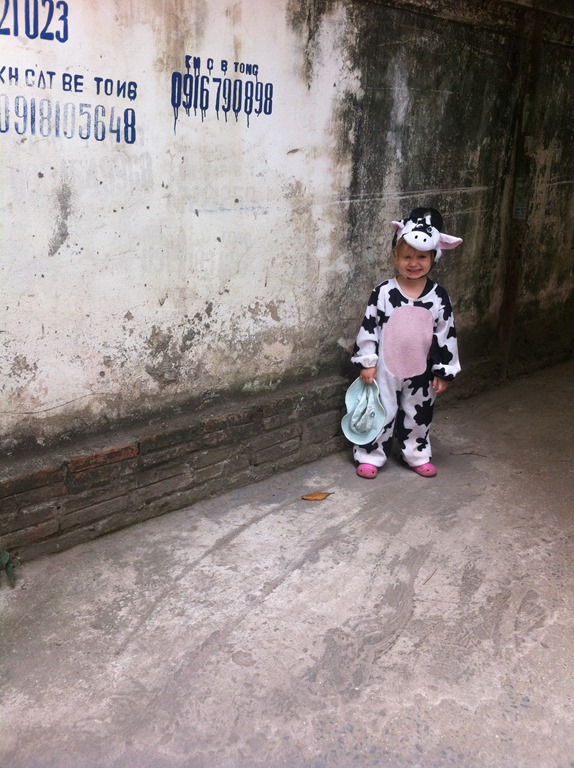 Après la sieste, nous allons chercher les frère et sœurs au bus…souvent déguisée (que Violette!)