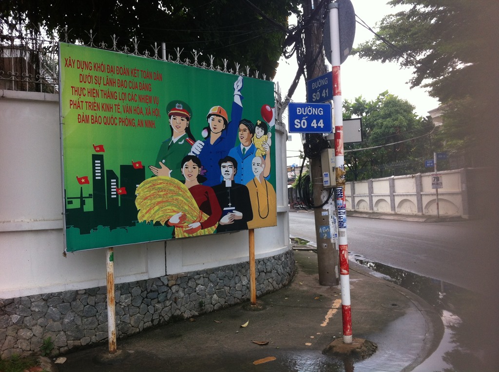 Je cherche cherche une maison… Ce prêtre en col romain au milieu du militaire, du col bleu, du moine, de la paysanne et de ces drapeaux vietnamien est étonnant non?