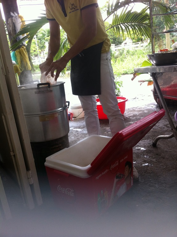 J’en profite pour assister à la manière de garder le riz chaud: hop directement dans l’énorme glacière Coca Cola!