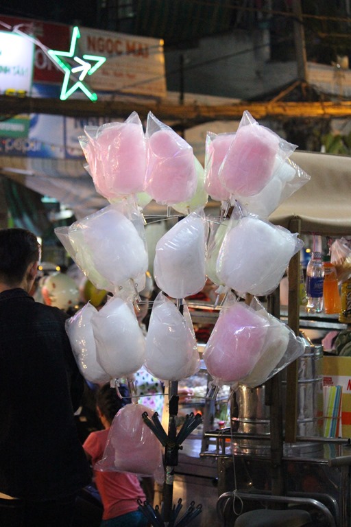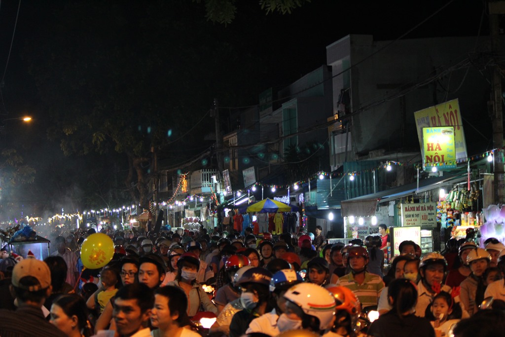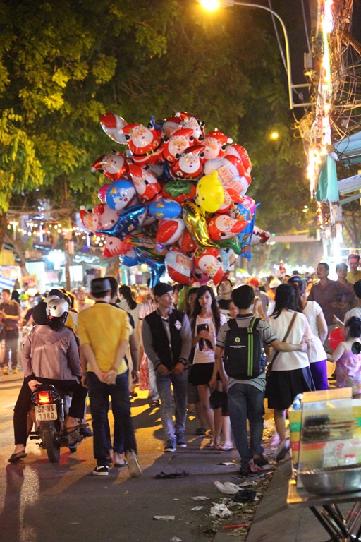 Nous sommes un soir allés nous promener avec des amis dans une des rues dite “catholiques” de Saigon. La rue devait être piétonne mais nous y étions un jour trop tôt…. (Pas de voiture mais des motos à touche touche)