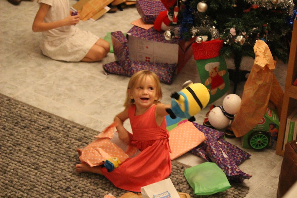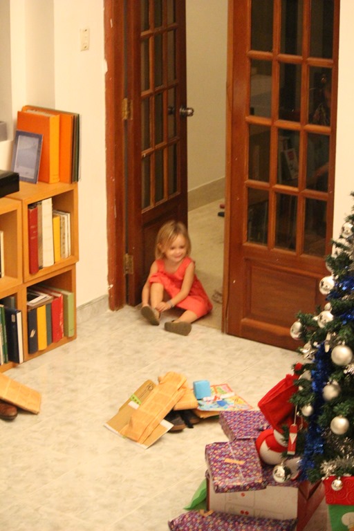 Malgré l’excitation, l’attente interminable à la messe, la vue des cadeaux, Violette prend quand même le temps d’enlever ses chaussures (comme dans toutes les maisons au Vietnam)…