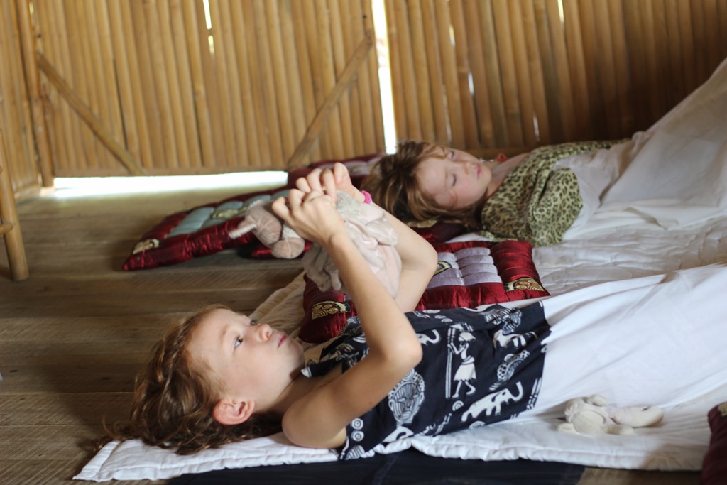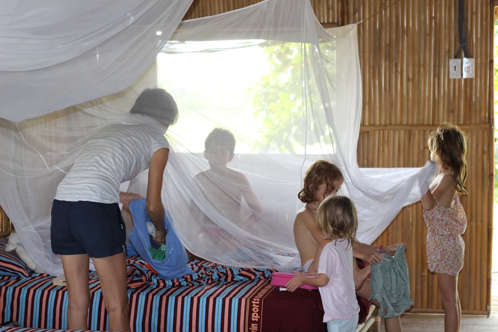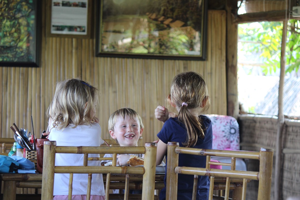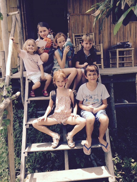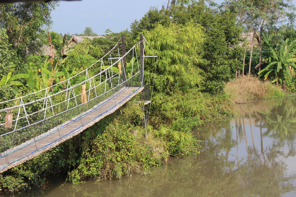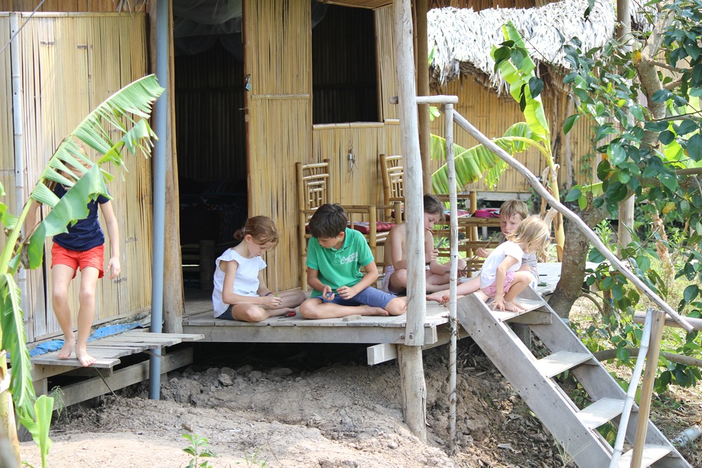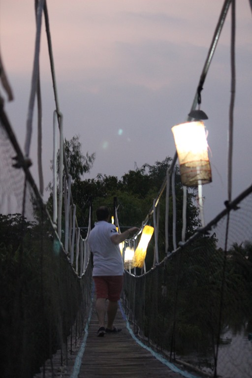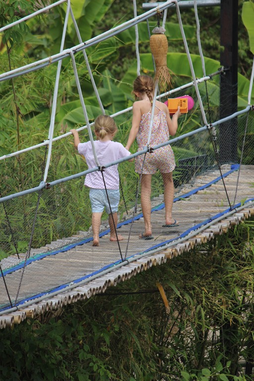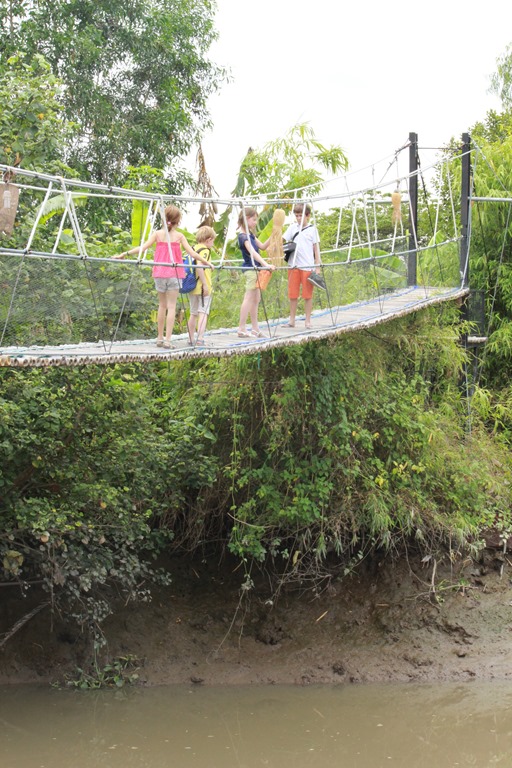 Depuis le resto: pont de singes pour rejoindre les chambres. Nous sommes en pleine nature, sur un bras du Mekong: les enfants sont aux anges…euh, les parents aussi!