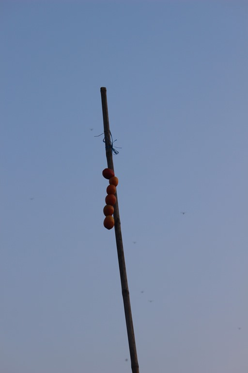 Sur les bouts de bois verticaux, chaque bateau accroche en haut ce qu’il vend