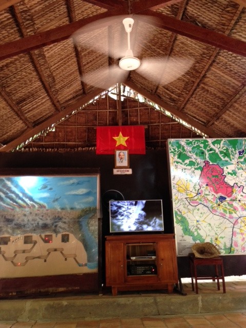 Expérience étrange aussi de se retrouver dans une cabane en bambou, une cagna, sous le regard d’Oncle Hô pour regarder un film de propagande (re-spéciale dédicace à GP): Sensation bizarre… Les ventilos, la télé et les cartes en plus…