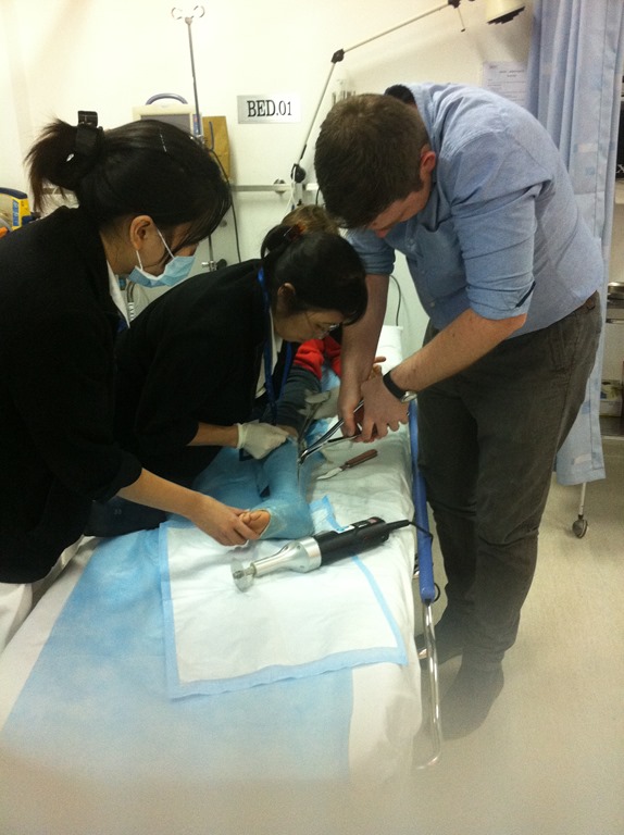Le plâtre a finalement été enlevé ( tu le sais) mais on a du prendre une scie sauteuse, accrocher l’enfant a une poulie par les bras, accrocher chaque côté du plâtre a des cordes qui ont été tirés simultanément par deux buffles… Bref belle galère mais quellle expérience!