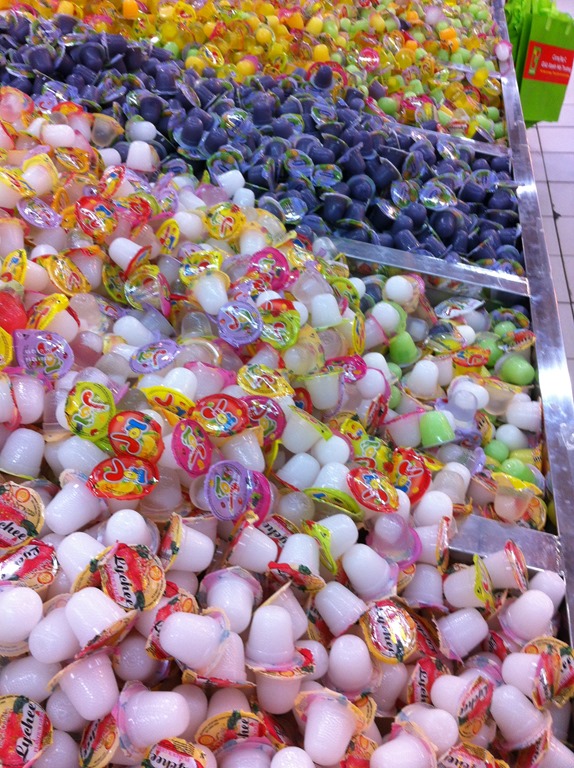 Des petites gelées individuelles: melon, lychee, prune, Tuti-Frutti, oeufs, mangue…Allez on se lance…